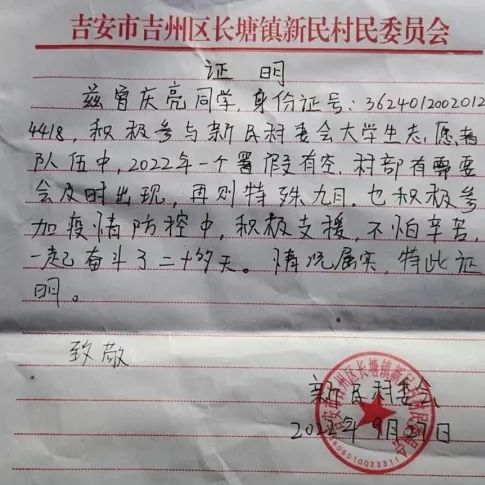 我的家乡在江西省吉安市吉州区长塘镇新民村,在假期期间,我自愿参加老员工志愿服务,积极参加疫情防控 。在假期期间,我参加了许多农村志愿者活动,例如:参与农村核酸防控工作,走访农村户厕改革,参与桔杆灭火保护环境,组织小员工农村实践活动,看望孤寡老人,宣传防溺水安全知识,外派支援卫生院和农村村委会。
