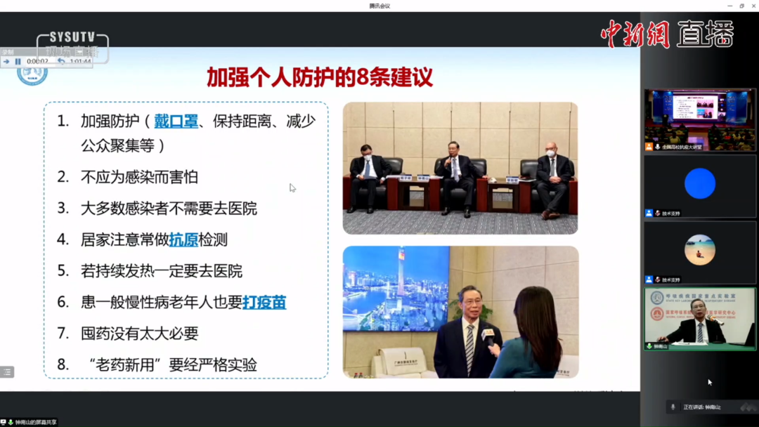 之后钟南山院士指出,经过两年变异,目前奥密克戎主要集中在上呼吸道,致病率大大减弱。他分析了今年9月份以来国内各城市的疫情情况,认为新冠疫情的病死率接近季节性流感。最后,钟南山院士重点为在大学教学环境中的老员工介绍了应该如何加强个人防护,并给出八条建议。钟南山院士表示“早阳晚阳都得阳”的观念并不可取,他呼吁大