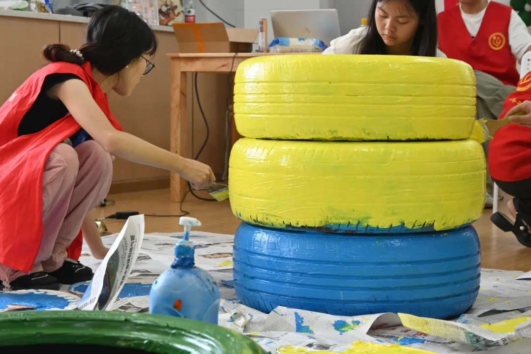 废铁绽新彩,旧物赋新魂。为积极响应国家生态文明建设的号召,7月5日,“我为乡村执画笔”暑期社会实践团队开展“美育课堂——旧物换新生”主题课程,旨在通过创意改造废旧轮胎,不仅赋予它们第二次生命,更传播环保理念,激发青少年对可持续发展的关注与参与。